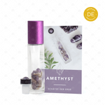 Contents: 1 x Amethyst gemstone rollerball, 10ml clear roller bottle approximately 1/3 full of Amethyst gemstone chips, co-ordinated aluminium cap & instructional card - GERMAN