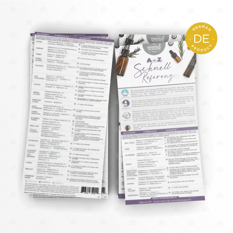 The quick reference A-Z cards are an introduction to how to use essential oils for 50 common ailments - GERMAN.