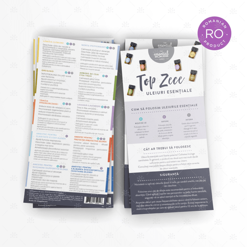 Part of the "Essential Knowledge Series", this ROMANIAN rack card is an ideal quick reference guide containing an overview and suggested uses of the top ten essential oils. These cards are perfect companions to your reference tools and guides.