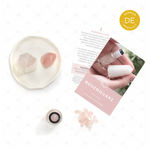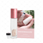 Contents: 1 x Rose Quartz gemstone rollerball, 10ml clear roller bottle approximately 1/3 full of Rose Quartz gemstone chips, co-ordinated aluminium cap & instructional card - GERMAN