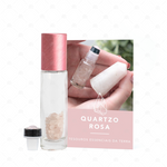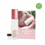 Contents: 1 x Rose Quartz gemstone rollerball, 10ml clear roller bottle approximately 1/3 full of Rose Quartz gemstone chips, co-ordinated aluminium cap & instructional card - PORTUGUESE