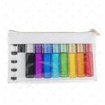 Contents: 9 Frosted Deluxe Glass Roller Bottles, Premium Stainless Rollers and Metallic Caps with Clear Zipper Pouch