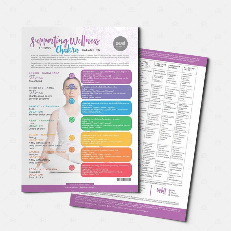 One side the sheet outlines basic information for understanding the 7 chakras: objective, colour, affirmation, essential oils, related virtue.