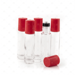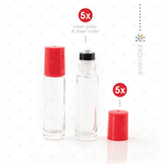 Contents: 5 x 10ml clear bottles with Lipstick Kiss (red) cap and new style stainless steel rollerballs