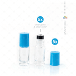 Contents: 5 x 5ml clear bottles with astronaut blue cap and new style stainless steel rollerballs