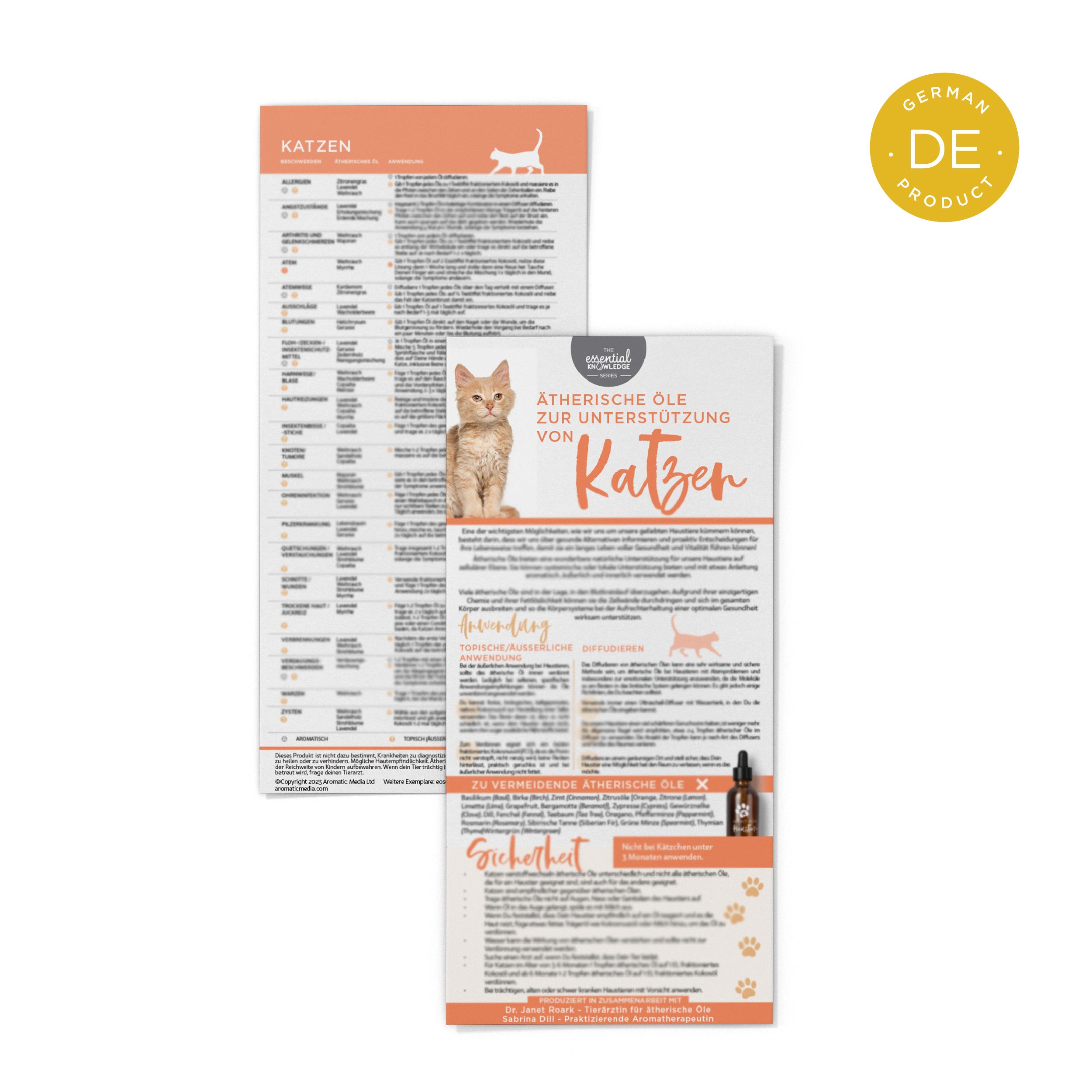 The front of this card details usage guidance for topical use and diffusing as well as safety, while the back of the card has details on how to use your essential oils for different ailments that may affect your cat.