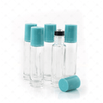 Contents: 5 x 10ml clear bottles with mermaid tail (teal) cap and new style stainless steel rollerballs