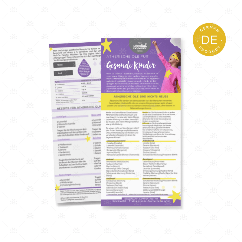 If you have children you'll know just how much they often require support to maintain good health. This rack card, part of the "Essential Knowledge Series" and produced in conjunction with Sabrina Dill - Practicing Aromatherapist, is an ideal reference guide containing suggested essential oils and blends to use for supporting children with everyday wellness. - GERMAN